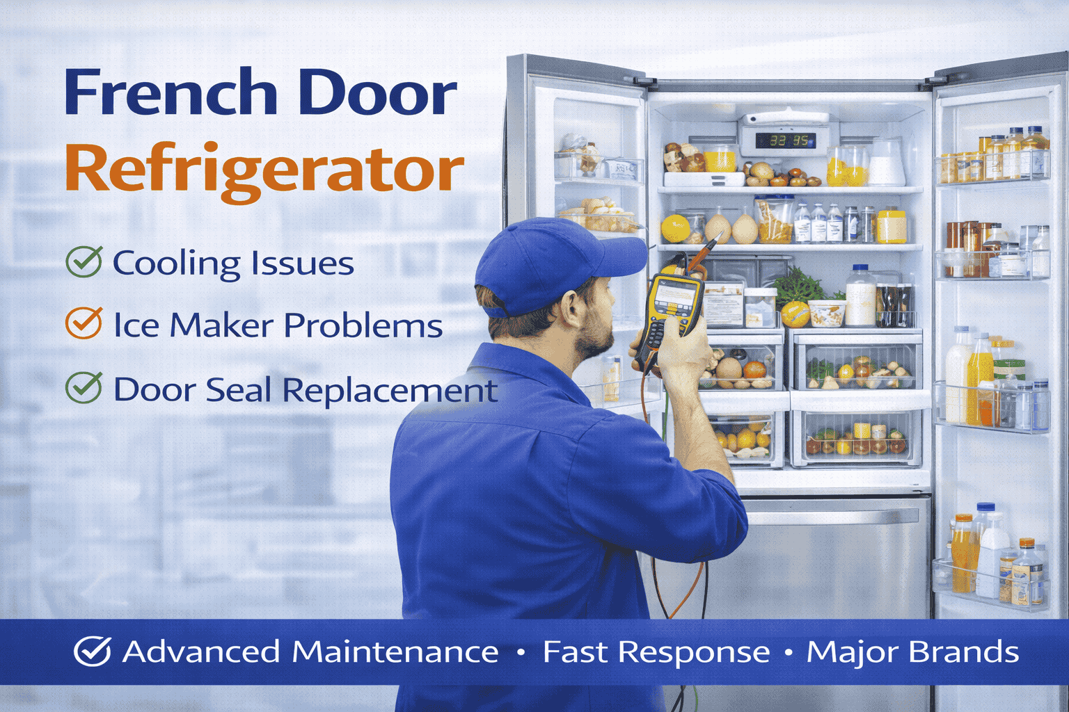 Premium model with vertical split design. Popular in modern Bahraini villas. Common Issues We Fix:Ice and water dispenser problems Electronic control panel failures Multi-zone cooling issues Filter replacement and water line leaks Door balance problems